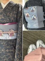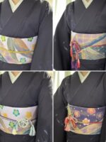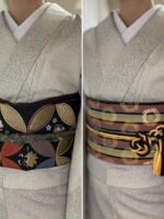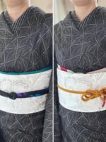 袋帯で二重太鼓結びをする方法はいくつかあります。写真1枚目左は手結びで、写真1枚目右は『帯まくら』という道具を使って結んでいます。それぞれに良い点と気をつける点があります。私はいつも装う時は背中で手結びをしますが、道具を […]