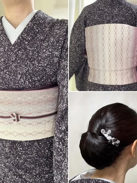 着物はさわやか縮緬という軽くて涼やかな縮緬地の着物で、富田染工芸で染められた江戸小紋です。帯は西陣織元の綵巧で織られた三軸名古屋帯です。美しいグラデーションが表現されていて多彩な色糸が使われているため、着物の色柄を選ばす合わせられます。