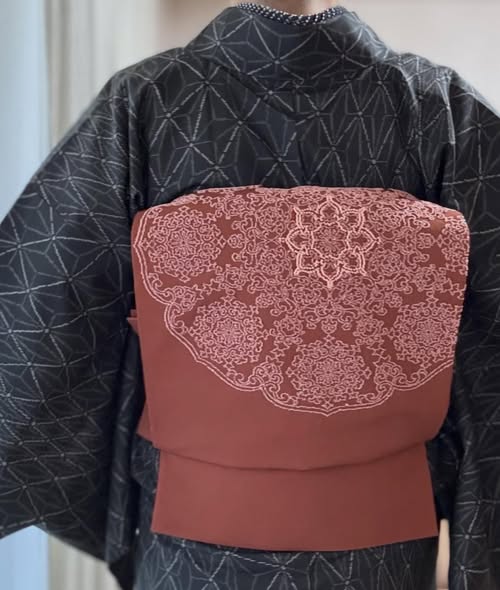 こちらの袋帯は、巻いていくとお腹の部分に柄が出ますが、この柄の位置が5センチ変わるだけでお太鼓の柄が出にくくなってしまいます。